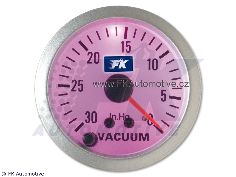 Budík vacuum, bílý podklad, průhledné sklo, průměr 52mm, podsvícení sedmibarevné, v barech.
