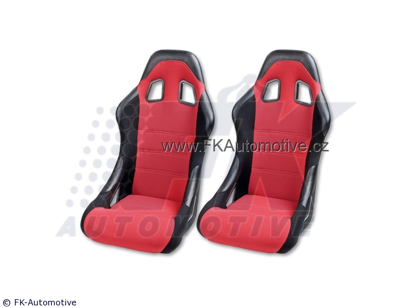 Sportovní sedačky pravá + levá, červená barva, pevná-nesklopná, kombinace látky a kůže. Cena je za pár. Délka konzole 350mm.