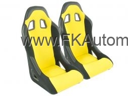 Sportovní sedačky pravá + levá, žlutá barva, pevná-nesklopná, kombinace látky a kůže. Cena je za pár. Délka konzole 350mm.