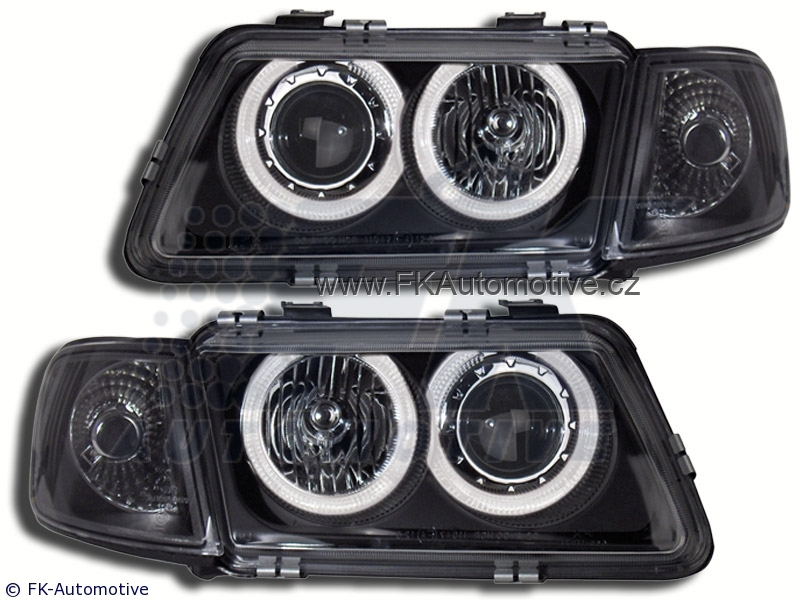 Přední světla Angel Eyes na Audi A3 typ 8L, r.v. 96-00, černé pozadí, včetně blinkrů. Homologace E. Cena je za pár.