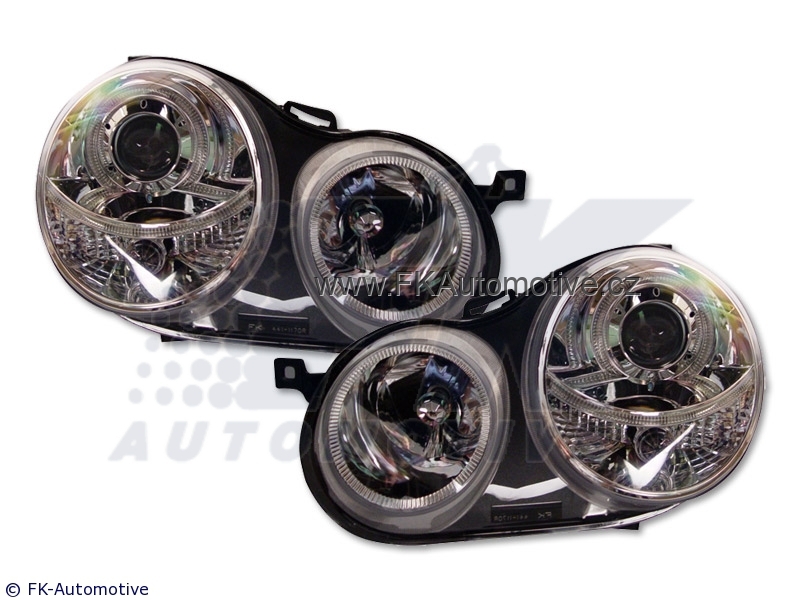 Přední světla Angel Eyes na VW Polo 9N r.v. 01-05, chromové pozadí, integrovaný blinkr. Homologace E. Cena je za pár.