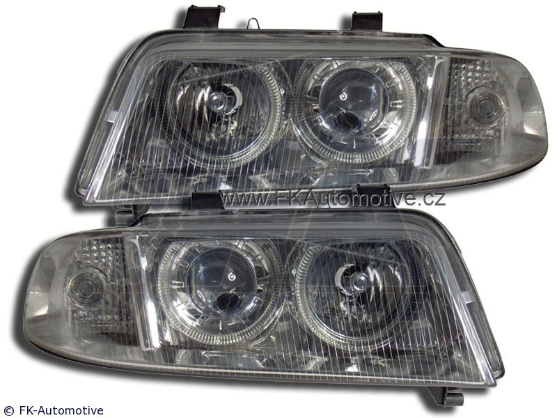 Přední světla Angel Eyes na Audi A4 typ B5 r.v. 97-01, chromové pozadí, integrovaný blinkr. Homologace E. Cena je za pár.