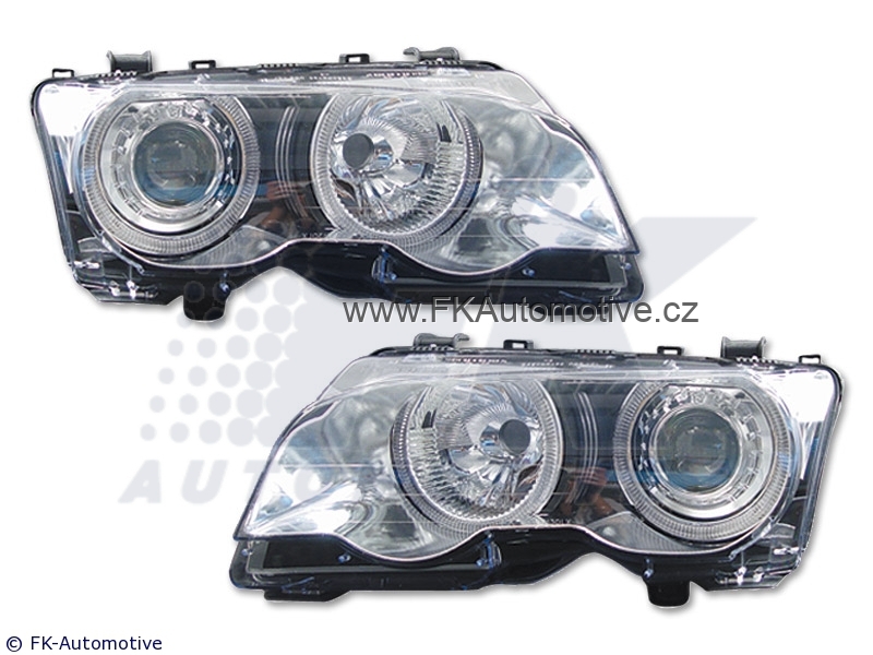 Přední světla Angel Eyes na BMW E46 Coupé r.v. 01-03, chromové pozadí, el. naklápění. Homologace E. Cena je za pár.