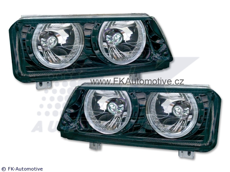Přední světla Angel Eyes na VW Passat 35i r.v. 93-96, černé pozadí, včetně záslepek blinkrů. Homologace E. Cena je za pár.