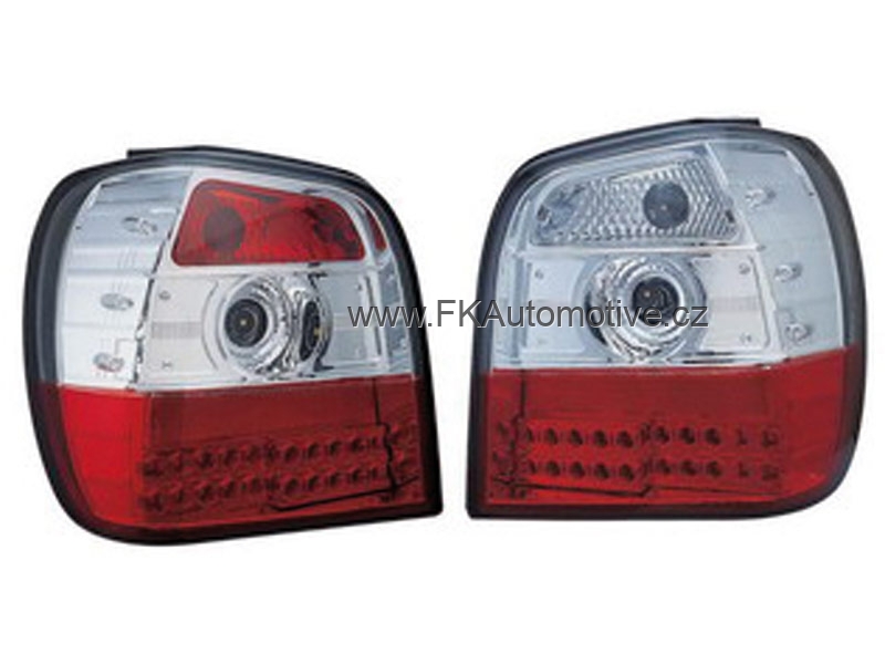 Zadní tuningová světla LED na VW Polo 6N r.v. 95-98, červeno-čiré pozadí, homologace E. Cena je za pár.
