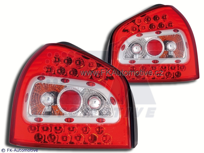 Zadní tuningová světla LED na Audi A3 typ 8L r.v. 96-02, červeno-čiré pozadí, homologace E. Cena je za pár.