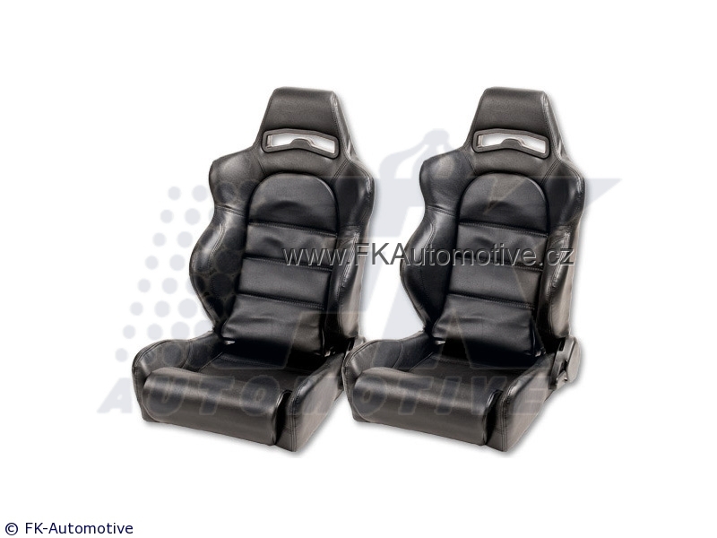 Sportovní sedačky pravá + levá strana, černá barva, sklopná-polohovací, kožená-polokůže. Cena je za pár. Délka konzole 405mm.