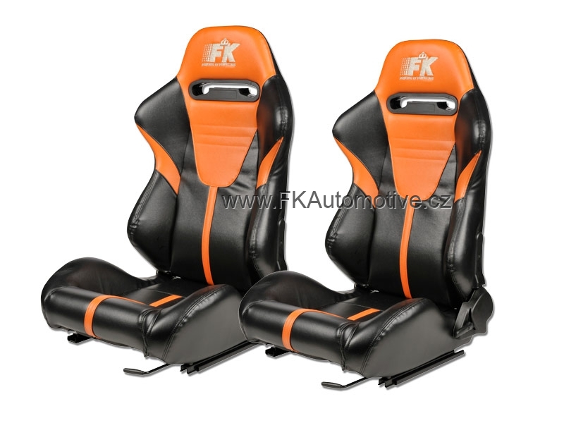 Sportovní sedačky levá + pravá strana, černo-oranžová barva, sklopná-polohovací, kožená-hladká. Cena je za pár.