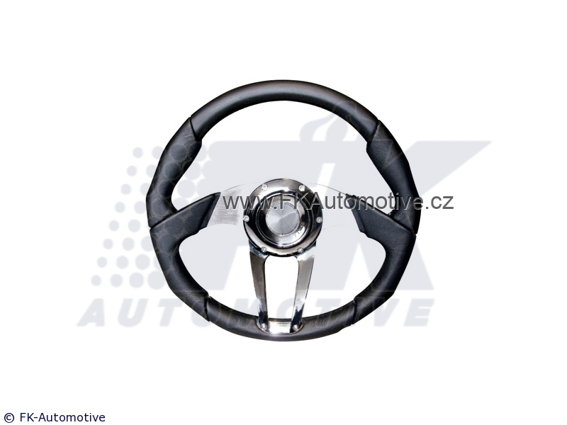 Sportovní volant, pravá kůže, černo-kovový design, ergonomický tvar, průměr 350mm.