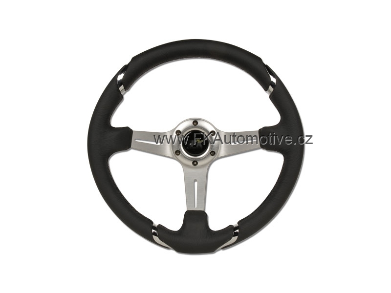 Sportovní volant, černá kůže + kovový design, průměr 350mm.