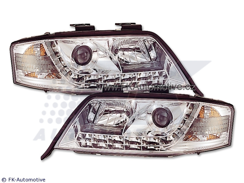 Přední světla s LED pruhem denního svícení, styl Devil Eyes na Audi A6 typ 4B, r.v. 01-04, chromové pozadí, integrovaný blinkr. Cena je za pár.