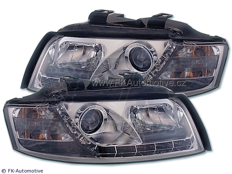 Přední světla s LED pruhem denního svícení, styl Devil Eyes na Audi A4 typ 8E, r.v. 01-04, chromové pozadí, integrovaný blinkr.Cena je za pár.