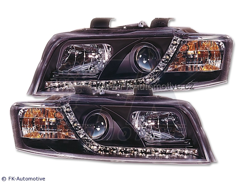 Přední světla s LED pruhem denního svícení, styl Devil Eyes na Audi A4 typ 8E, r.v. 01-04, černé pozadí, integrovaný blinkr.Cena je za pár.