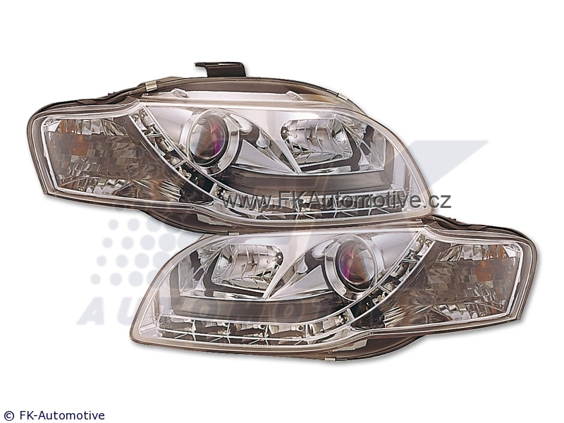 Přední světla s LED pruhem denního svícení, styl Devil Eyes na Audi A4 typ 8E, r.v. 05-07, chromové pozadí, integrovaný blinkr. Cena je za pár.