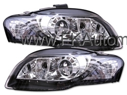 Přední světla s LED pruhem denního svícení, styl Devil Eyes na Audi A4 typ 8E, r.v. 05-07, černé pozadí, integrovaný blinkr. Cena je za pár.