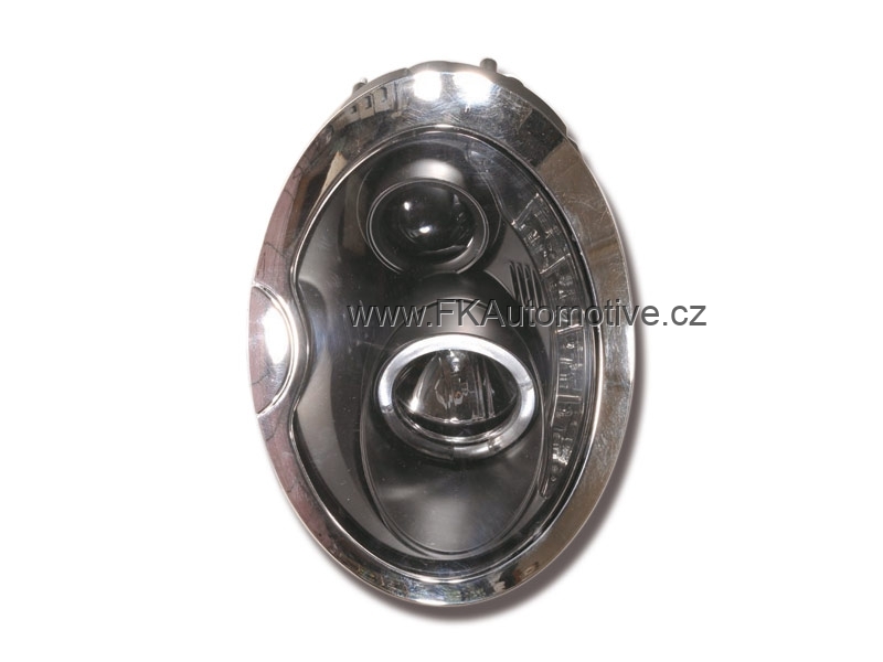 Přední světla s LED pruhem denního svícení, styl Devil Eyes na BMW Mini Cooper R50 r.v. 01-06, černé pozadí s el. naklápěním. Cena je za pár.