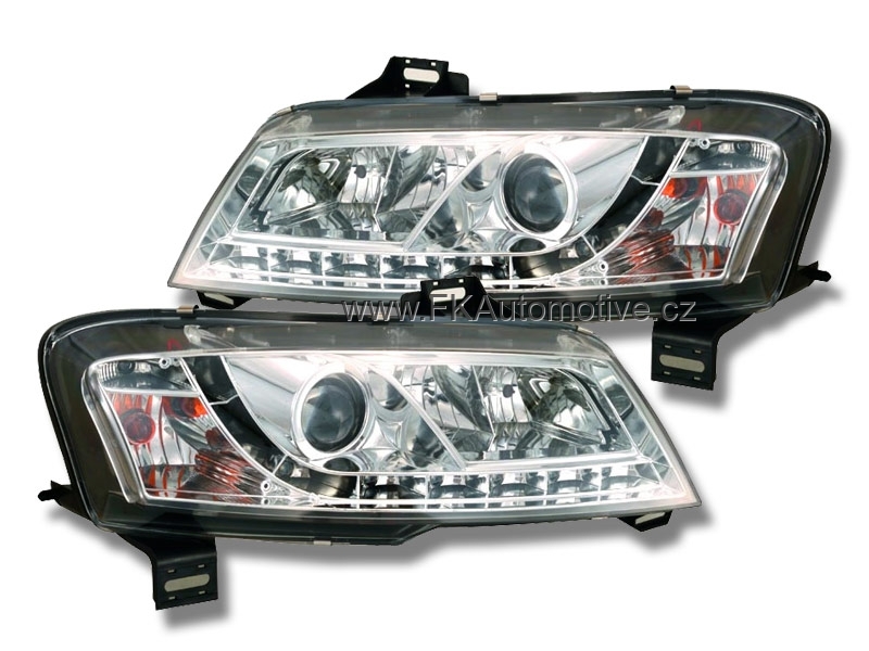 Přední světla s LED pruhem denního svícení, styl Devil Eyes na Fiat Stilo 3dvéř. r.v. 01-07, chromové pozadí, integrovaný blinkr. Cena je za pár.