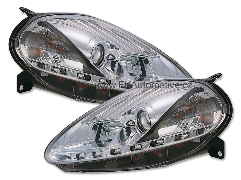 Přední světla s LED pruhem denního svícení, styl Devil Eyes na Fiat Grande Punto typ 199 3dvéř. r.v. 08-, chromové pozadí, integrovaný blinkr, s el. naklápěním. Cena je za pár.