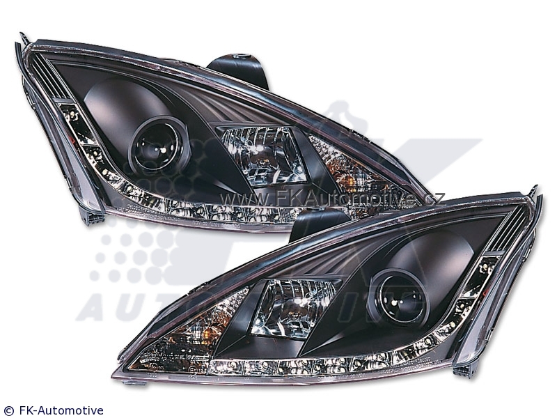 Přední světla s LED pruhem denního svícení, styl Devil Eyes na Ford Focus 3/4/5dvéř. r.v. 01-04, černé pozadí, integrovaný blinkr. Cena je za pár.