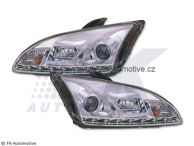 Přední světla s LED pruhem denního svícení, styl Devil Eyes na Ford Focus 4/5dvéř. r.v. 05-08, chromové pozadí, integrovaný blinkr. Cena je za pár.
