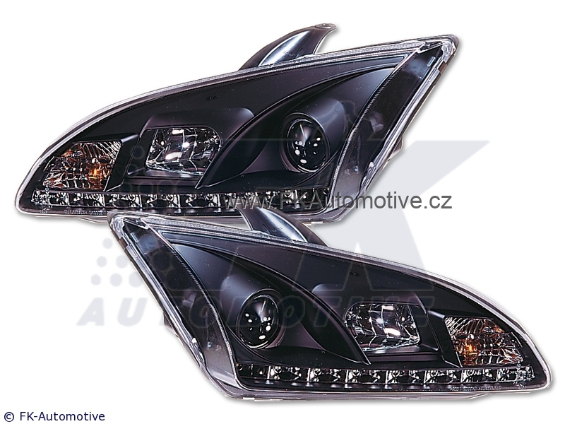 Přední světla s LED pruhem denního svícení, styl Devil Eyes na Ford Focus 4/5dvéř. r.v. 05-08, černé pozadí, integrovaný blinkr. Cena je za pár.