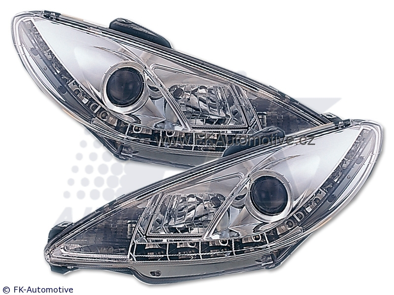 Přední světla s LED pruhem denního svícení, styl Devil Eyes na Peugeot 206 r.v. 98-, chromové pozadí, integrovaný blinkr. Cena je za pár.