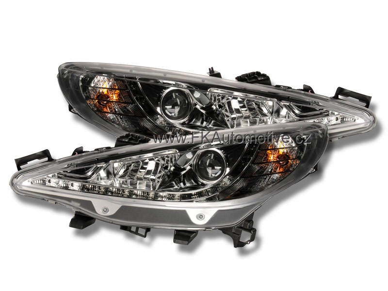 Přední světla s LED pruhem denního svícení, styl Devil Eyes na Peugeot 207 r.v. 06-, chromové pozadí, integrovaný blinkr, el. ovládání naklápění. Cena je za pár.