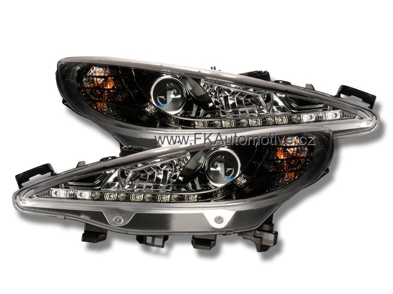 Přední světla s LED pruhem denního svícení, styl Devil Eyes na Peugeot 207 r.v. 06-, chromové pozadí, integrovaný blinkr, manuální ovládání naklápění. Cena je za pár.