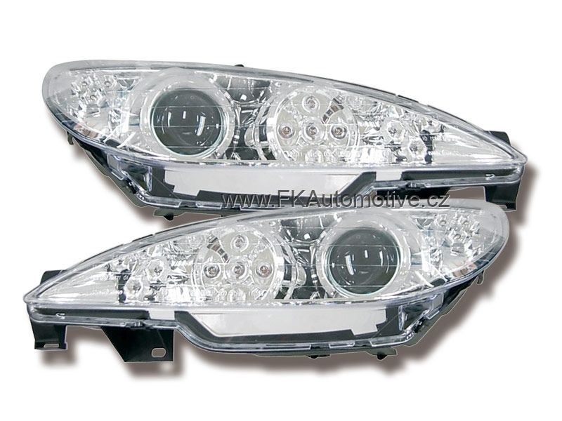 Přední světla s LED pruhem denního svícení, styl Devil Eyes na Peugeot 206 r.v. 98-05, chromové pozadí. Cena je za pár.
