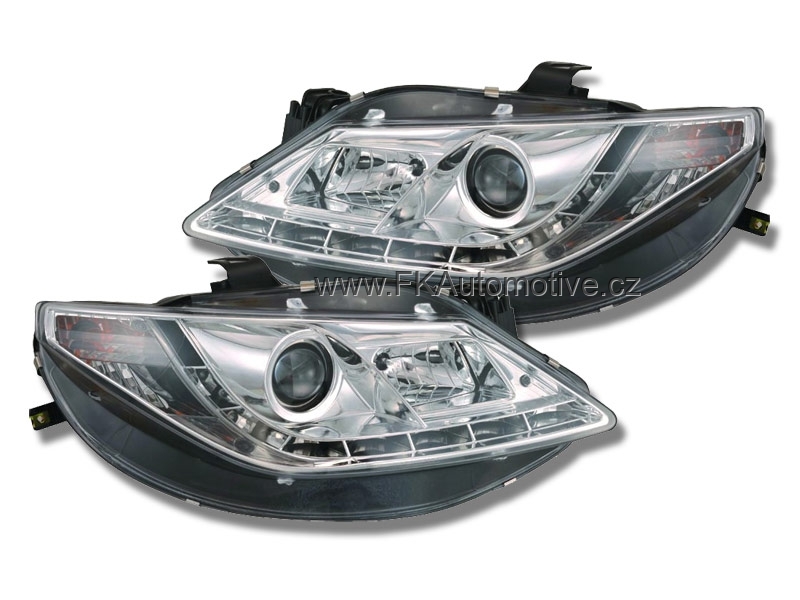 Přední světla s LED pruhem denního svícení, styl Devil Eyes na Seat Ibiza r.v. 08-, chromové pozadí. Cena je za pár.