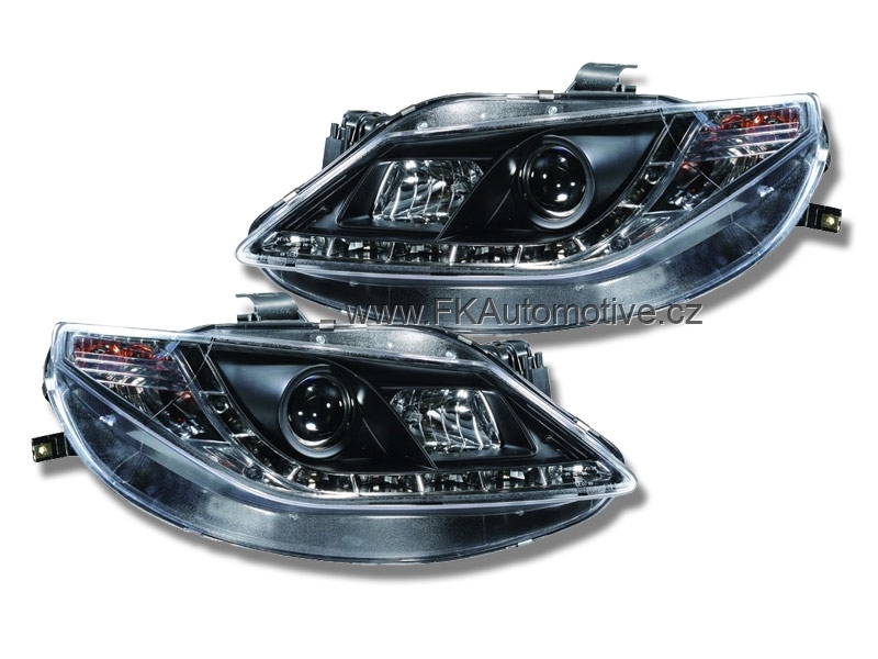 Přední světla s LED pruhem denního svícení, styl Devil Eyes na Seat Ibiza r.v. 08-, černé pozadí. Cena je za pár.
