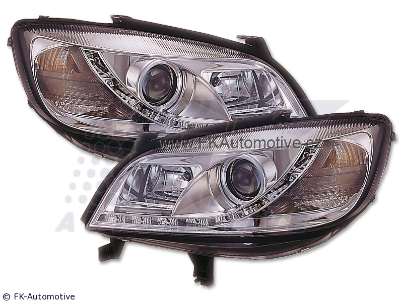 Přední světla s LED pruhem denního svícení, styl Devil Eyes na Opel Zafira r.v. 99-04, chromové pozadí, integrovaný blinkr. Cena je za pár.