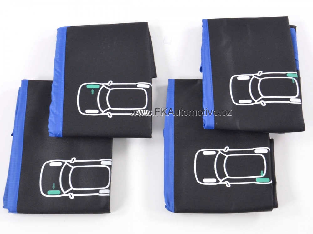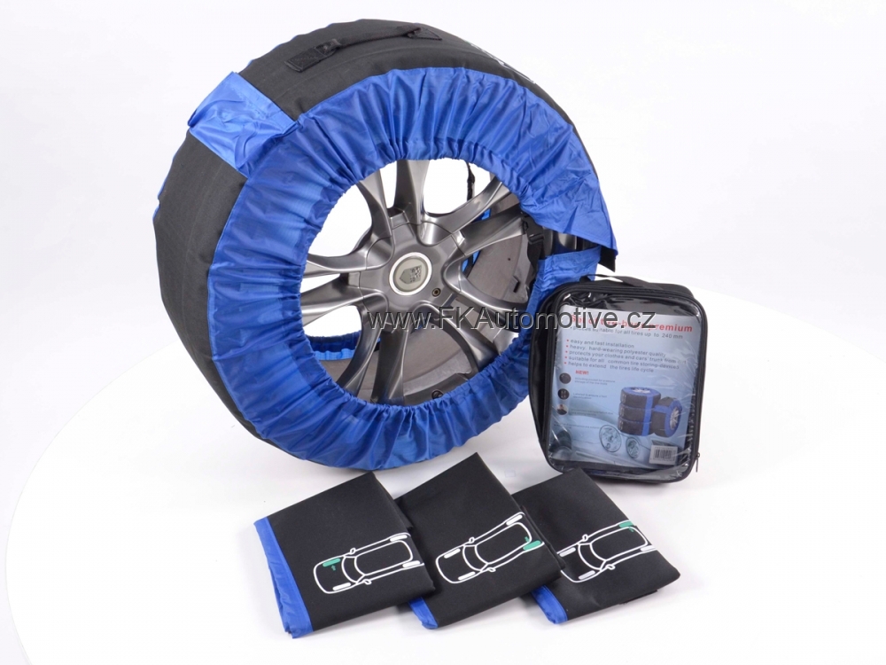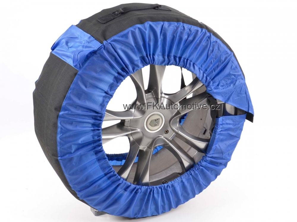 Ochranný obal na pneumatiky a hl. kola, universální na velikost kol "14-18", do max. šíře pneu 245mm, černo-modré, snadné čištění. Cena je za sadu 4kusů obalu.