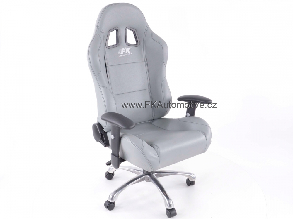 Sportovní kancelářská židle s opěrkami pro závodní pocit v kanceláři, materiál polokůže, nastavitelná výška opěradla, barva šedá s černými švy, včetně područek. Max. nosnost 150kg, chromovaná základna