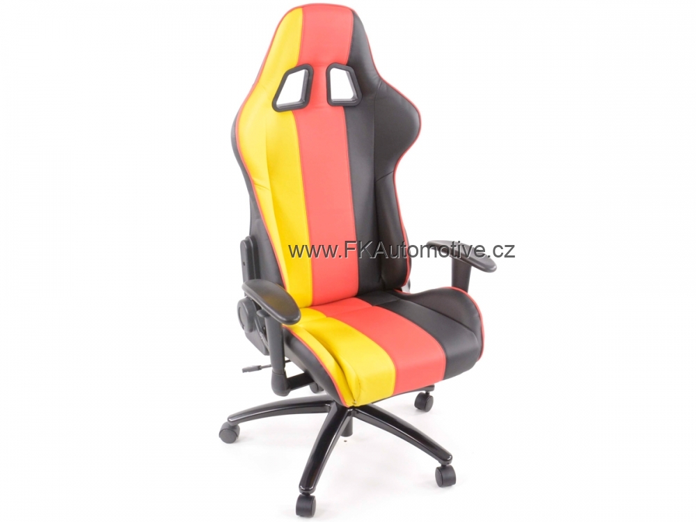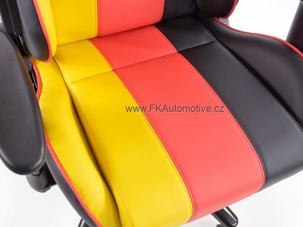 Sportovní kancelářská židle s opěrkami pro závodní pocit v kanceláři, otočná, materiál polokůže, nastavitelná výška opěradla, barva černá+červená+žlutá, včetně područek. Max. nosnost 150kg, kovová základna.