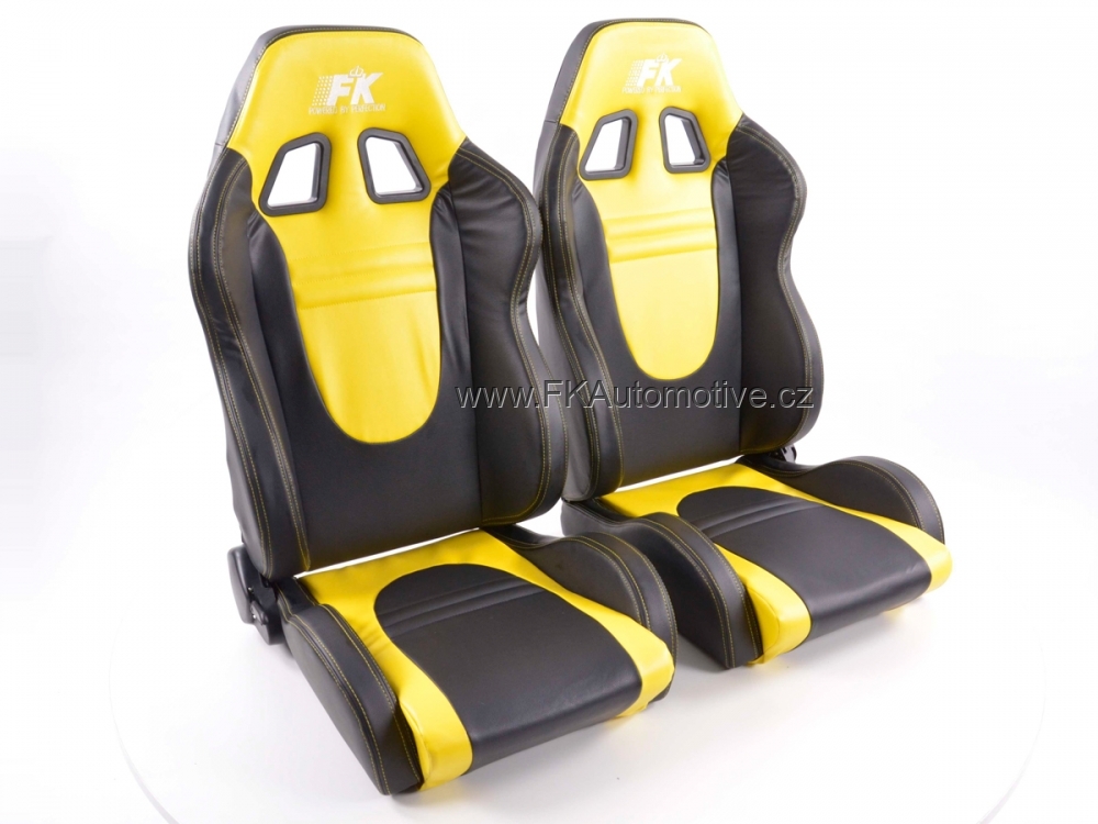 Sportovní sedačky Racecar, žluto-černé, polokůže, bez homologace, délka konzole 350mm, universální, sklopná a polohovací. Cena je za pár.
