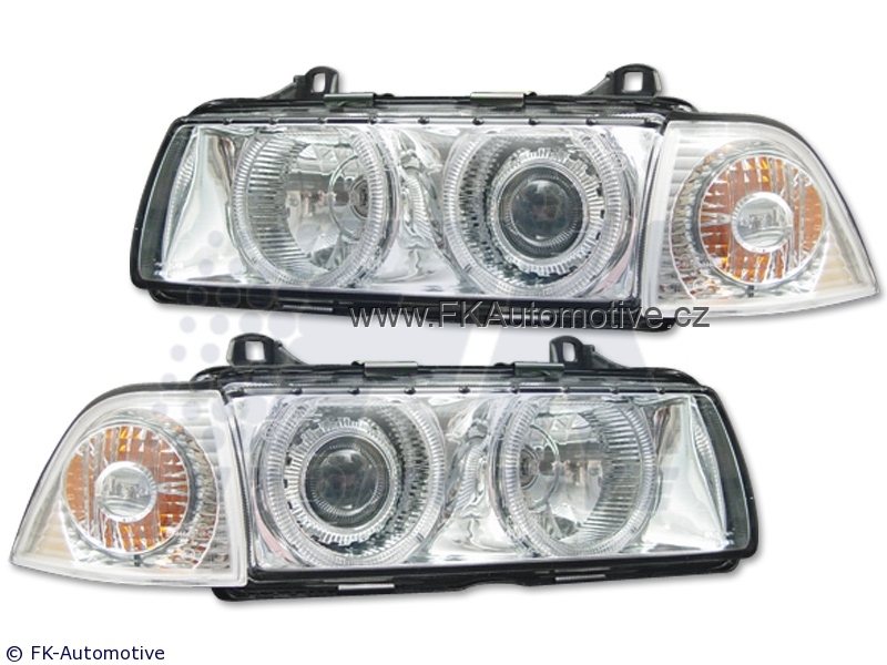 Přední světla Angel Eyes na BMW E36 Lim. r.v. 92-98, chromové pozadí, včetně blnkrů. Homologace E. Cena je za pár.