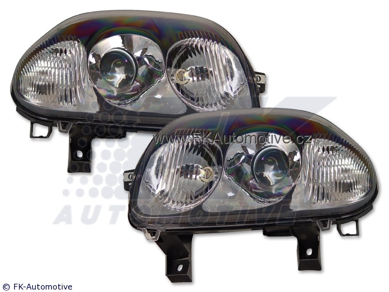 Přední světla Design na Renault Clio B r.v. 98-01, černé pozadí, integrovaný blinkr. Homologace E. Cena je za pár.