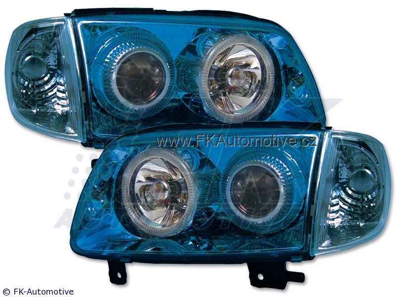 Přední světla Angel Eyes na VW Polo 6N2 r.v. 99-01, pozadí modrý chrom, včetně blinkrů, pro el. naklápění. Homologace E. Cena je za pár.