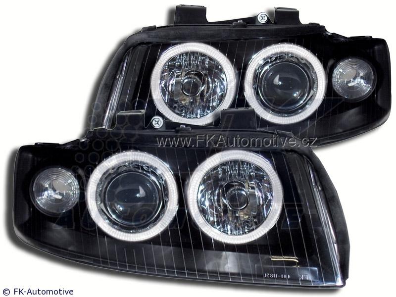 Přední světla Angel Eyes na Audi A4 typ 8E r.v. 01-04, černé pozadí, integrovaný blinkr. Homologace E. Cena je za pár.