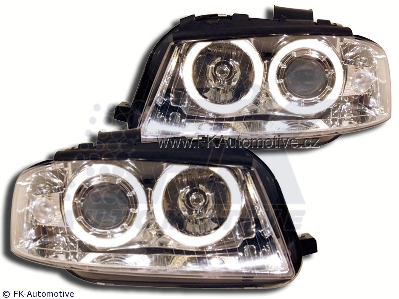 Přední světla Angel Eyes na Audi A3 typ 8P r.v. 03-07, chromové pozadí, integrovaný blinkr. Homologace E. Cena je za pár.