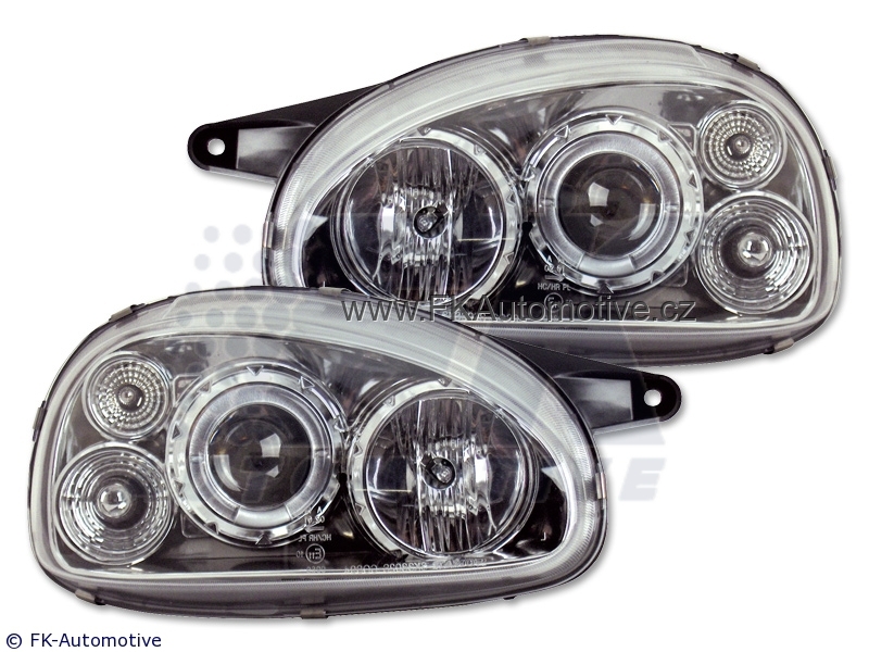 Přední světla Angel Eyes na Opel Corsa B r.v. 94-00, chromové pozadí, integrovaný blinkr. Homologace E. Cena je za pár.
