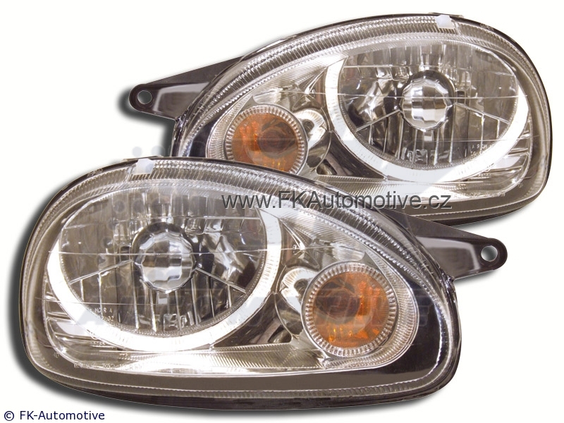 Přední světla Angel Eyes na Opel Corsa B r.v. 94-00, chromové pozadí, integrovaný blinkr, pro el. naklápění. Homologace E. Cena je za pár.