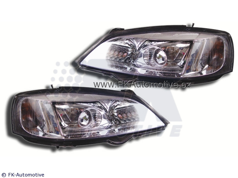 Přední světla Design na Opel Astra G r.v. 98-03, chromové pozadí, integrovaný blinkr. Homologace E. Cena je za pár.