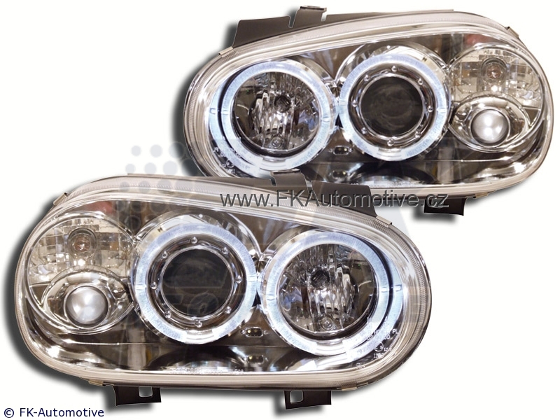 Přední světla Design s kroužky na VW Golf 4 r.v. 98-03, chromové pozadí, integrovaný blinkr. Homologace E. Cena je za pár.