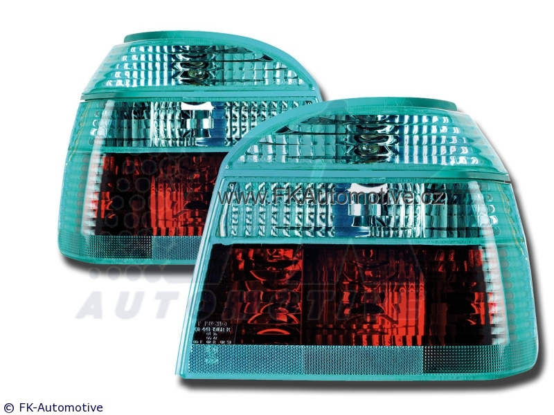 Zadní tuningová světla na VW Golf 3 r.v. 91-97, zelené pozadí, homologace E. Cena je za pár.