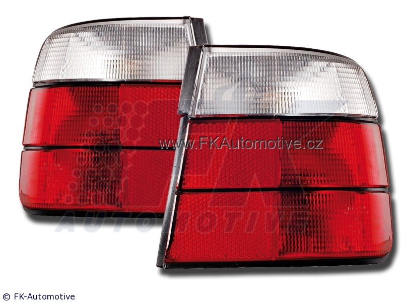 Zadní tuningová světla na BMW E34 Limousine r.v. 88-94 krystalově červeno-bílé pozadí, homologace E. Cena je za pár.