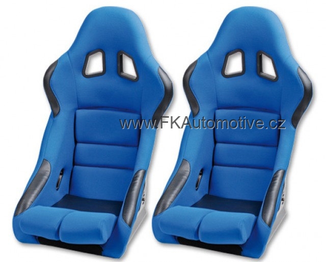 Sportovní sedačky pravá + levá, modrá barva, pevná-nesklopná, kombinace látky a kůže. Cena je za pár. Délka konzole 365mm.