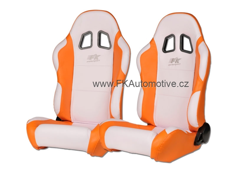 Sportovní sedačky levá + pravá strana, bílo-oranžová barva, sklopná-polohovací, polokožená. Cena je za pár. Uni konzole a pojezdy.
