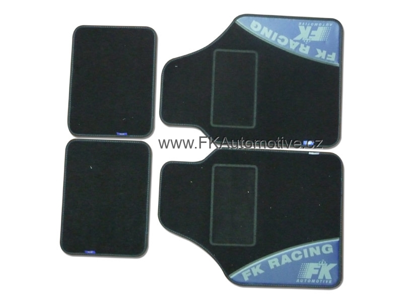 Látkové tuning koberce, nápis FK, černo-modré, 2x přední (640x470 mm) a 2x zadní (300x400 mm), universální. Cena je za sadu.